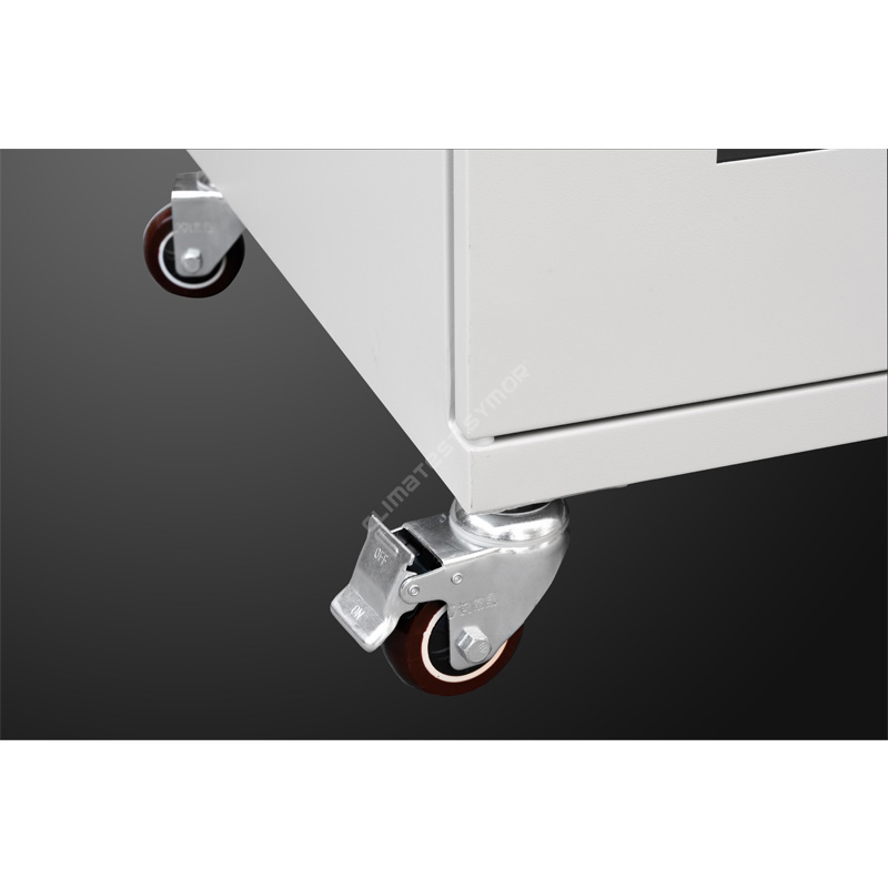- Kastor PU bertetulang dipasang di bahagian bawah kabinet kering elektronik, dua hadapan dengan brek untuk mudah bergerak dan berhenti.